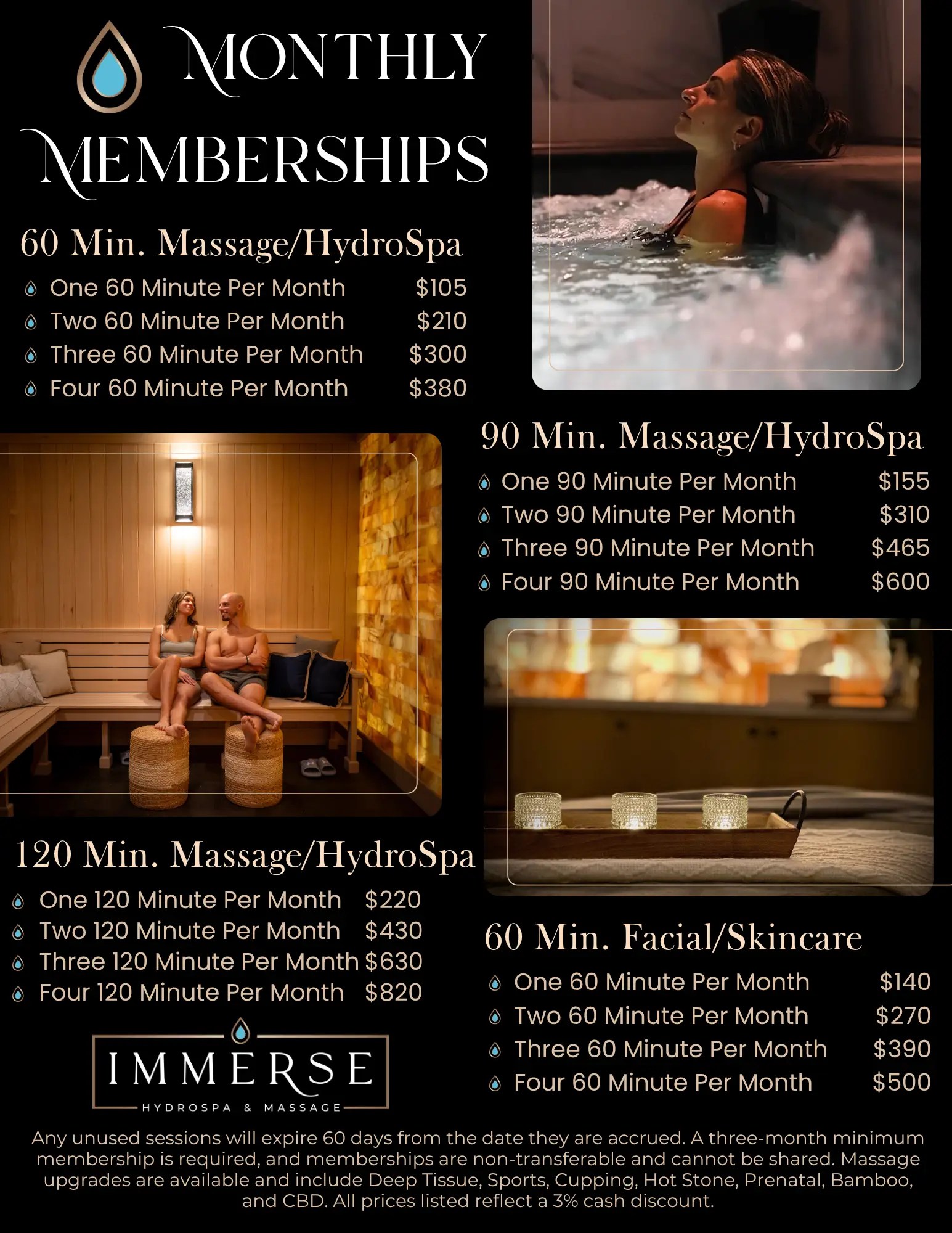 All package and membership vouchers can be used for massage, HydroSpa sessions, or a combination of both. Facial packages only available for facials.